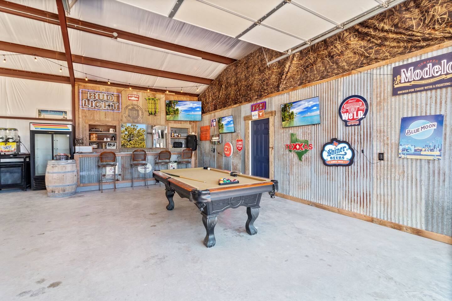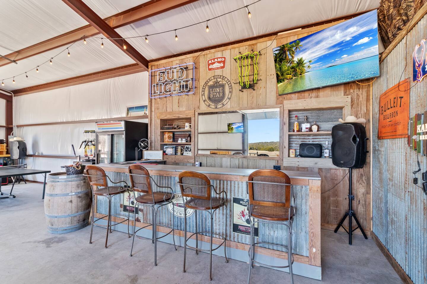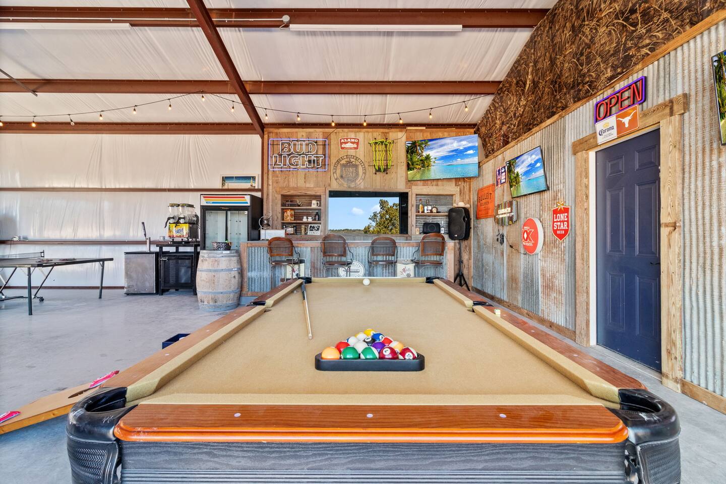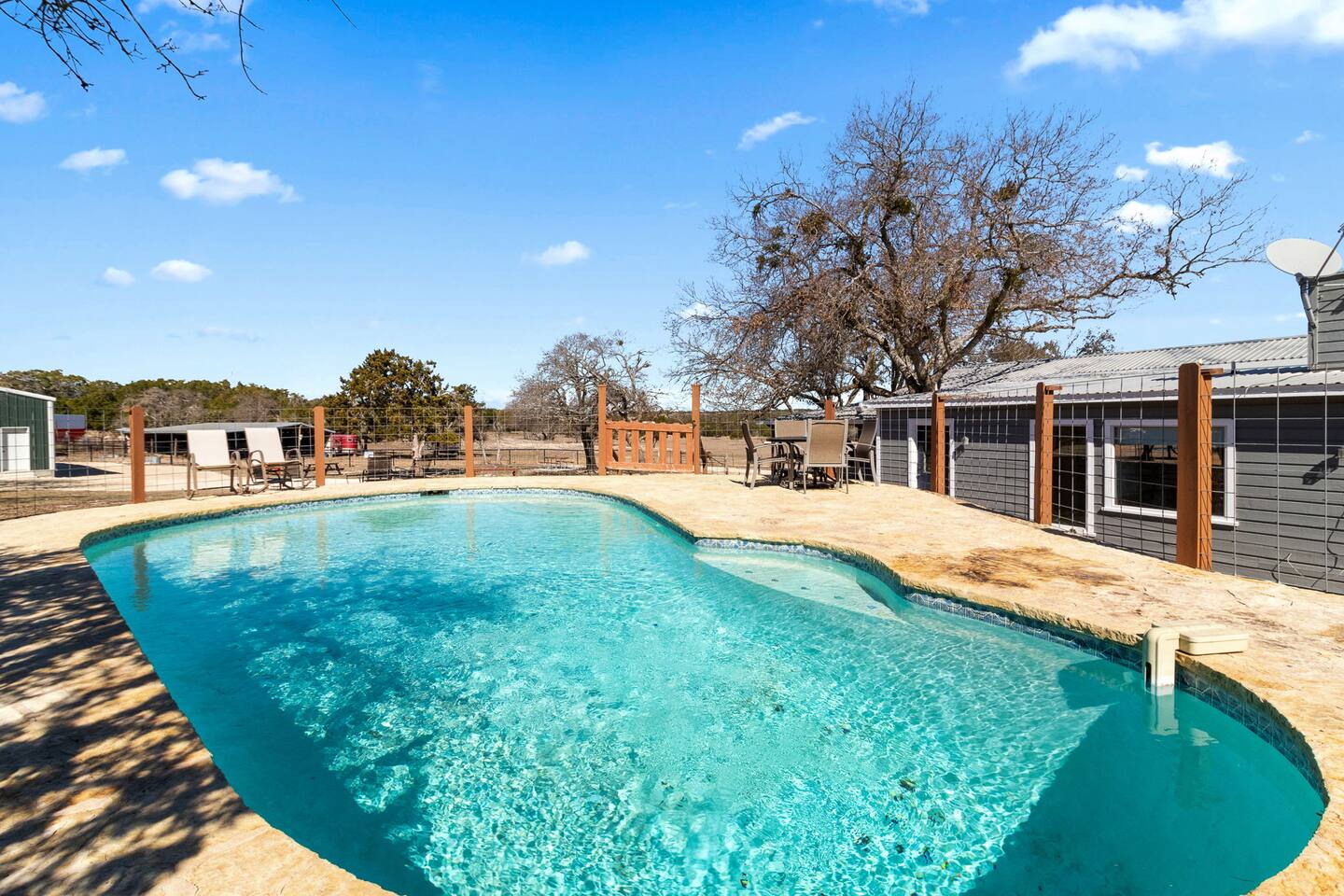 Porch & Prairie Ranch is your ultimate Texas ranch experience, just 30 minutes west of Fredericksburg, TX! Nestled within a vast 100-acre landscape, this offers you an unparalleled sense of privacy and seclusion, making it your ideal destination for seeking an escape from the hustle and bustle of your everyday life! You'll have high speed and reliable StarLink access during your stay! Your adventure begins as you step inside your spacious 3 bedrooms and 3 pristine bathrooms, a 'Texas Hill Country Ranch Rental' that blends rustic charm with modern comfort. The highlight is the cozy en-suite, providing you a tranquil sanctuary for relaxation! 8 adults will sleep comfortably in the main house with space for as additional 12 in the barn bunk room, complete with a mini split providing heated and cooled air all year round! The barn bunk room is designed for extra guests as there is no restroom tied to the bunk room. Bunk room guests will use the restrooms located inside the main home for use. Your haven is designed to accommodate up to 20 guests maximum(8-9 guests in the main house and 11-12 more guests in the bunk room inside the event barn). Event barn contains a bunk room with 3 sets of twin over full with trundle bunk beds that accommodates 12 when all sleeping surfaces are used, billiards and jacuzzi. This space shares bathroom and shower located in the main house. The barn does not have a bathroom or shower. Dive into your private swimming pool (not heated), relax in the jacuzzi or unwind on the inviting wrap-around porch, perfect for capturing 'Sunset Views in Texas'! Whether you're looking for a private family retreat, a romantic getaway, or a destination to celebrate life's special moments (think micro-wedding, family reunion, corporate event space), the Porch & Prairie Ranch has it all for you! Savor the peaceful seclusion of our 100-acre ranch, where you will be encircled by the quiet splendor of the natural world and the endearing companionship of our resident sheep and steer (as shown in the picture). Get exclusive use of our barn, which is furnished with a jacuzzi and pool tables and is ideal for entertaining and unwinding. This is more than just a getaway—it's a chance to create unforgettable memories in a picturesque countryside setting. Don’t miss this opportunity to experience your ranch style living. Book your stay today and start making memories that will last a lifetime! PLEASE NOTE: If you are looking to host an event of 16+ guests there are additional fees ranging from 1k - 10K :) A $500 refundable deposit will be collected after your booking is confirmed.