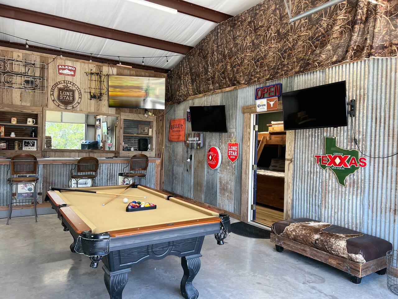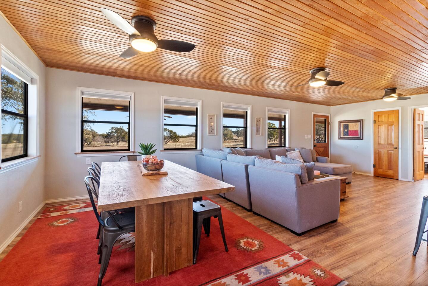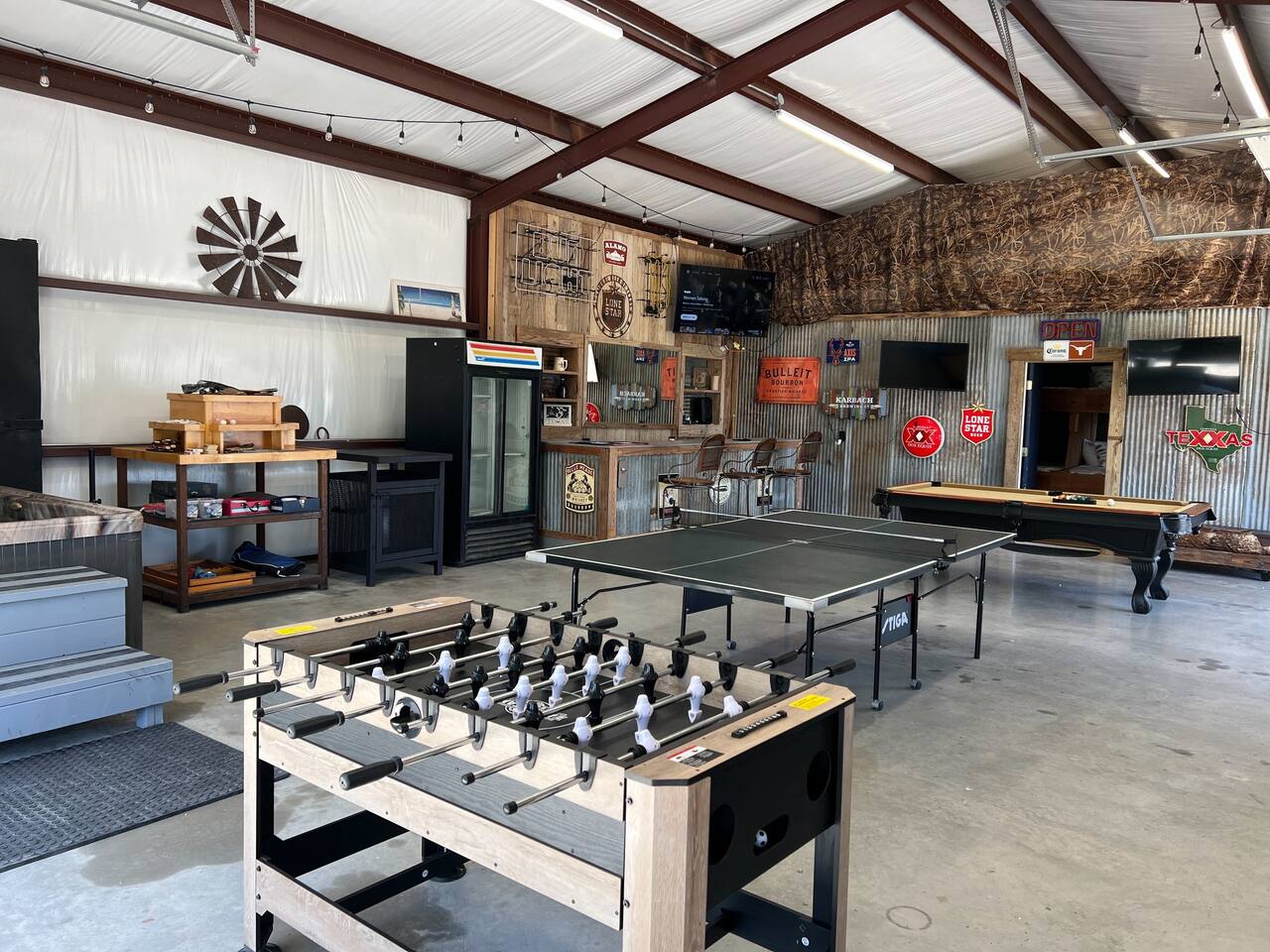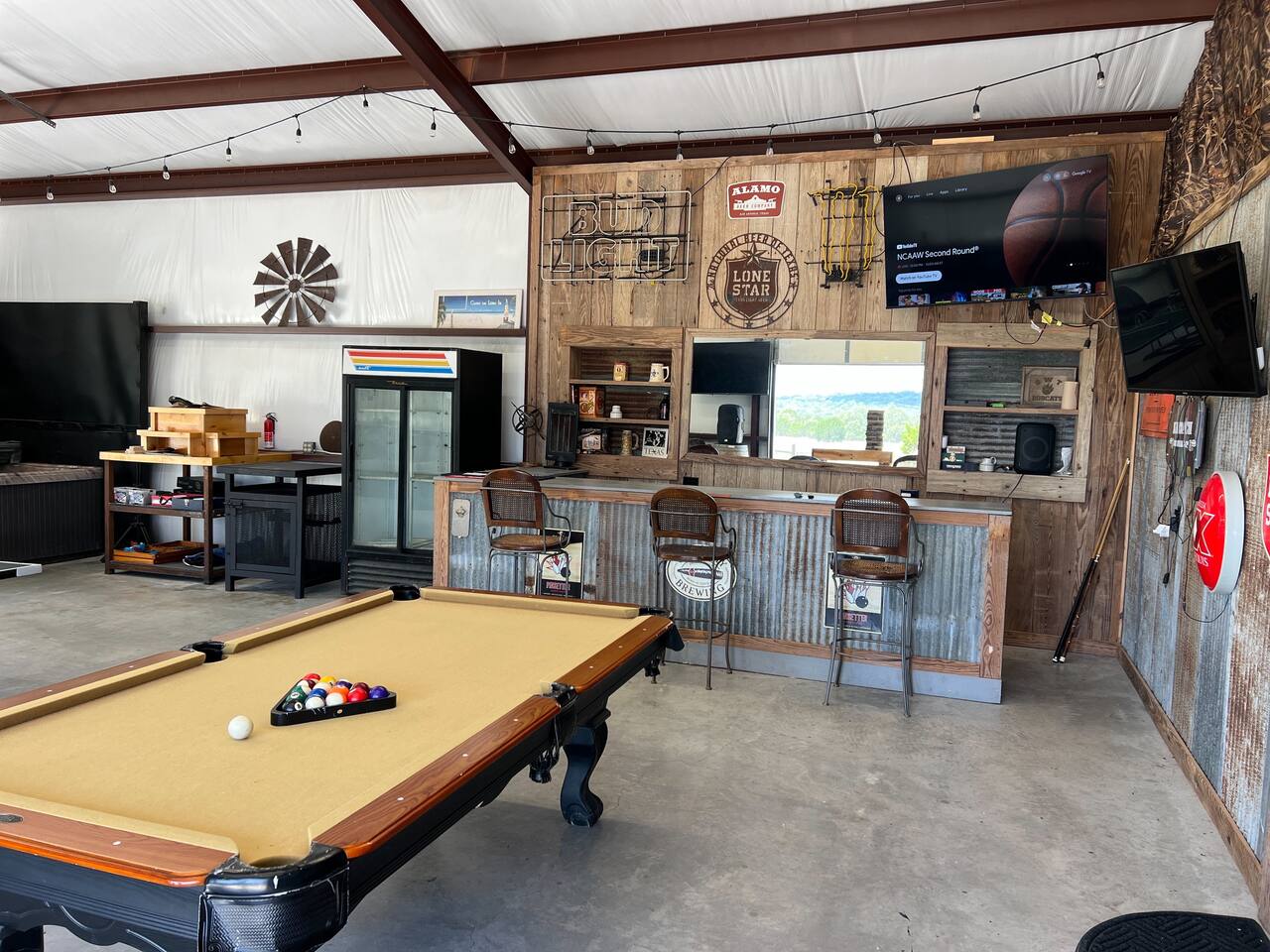 Porch & Prairie Ranch is your ultimate Texas ranch experience, just 30 minutes west of Fredericksburg, TX! Nestled within a vast 100-acre landscape, this offers you an unparalleled sense of privacy and seclusion, making it your ideal destination for seeking an escape from the hustle and bustle of your everyday life! You'll have high speed and reliable StarLink access during your stay! Your adventure begins as you step inside your spacious 3 bedrooms and 3 pristine bathrooms, a 'Texas Hill Country Ranch Rental' that blends rustic charm with modern comfort. The highlight is the cozy en-suite, providing you a tranquil sanctuary for relaxation! 8 adults will sleep comfortably in the main house with space for as additional 12 in the barn bunk room, complete with a mini split providing heated and cooled air all year round! The barn bunk room is designed for extra guests as there is no restroom tied to the bunk room. Bunk room guests will use the restrooms located inside the main home for use. Your haven is designed to accommodate up to 20 guests maximum(8-9 guests in the main house and 11-12 more guests in the bunk room inside the event barn). Event barn contains a bunk room with 3 sets of twin over full with trundle bunk beds that accommodates 12 when all sleeping surfaces are used, billiards and jacuzzi. This space shares bathroom and shower located in the main house. The barn does not have a bathroom or shower. Dive into your private swimming pool (not heated), relax in the jacuzzi or unwind on the inviting wrap-around porch, perfect for capturing 'Sunset Views in Texas'! Whether you're looking for a private family retreat, a romantic getaway, or a destination to celebrate life's special moments (think micro-wedding, family reunion, corporate event space), the Porch & Prairie Ranch has it all for you! Savor the peaceful seclusion of our 100-acre ranch, where you will be encircled by the quiet splendor of the natural world and the endearing companionship of our resident sheep and steer (as shown in the picture). Get exclusive use of our barn, which is furnished with a jacuzzi and pool tables and is ideal for entertaining and unwinding. This is more than just a getaway—it's a chance to create unforgettable memories in a picturesque countryside setting. Don’t miss this opportunity to experience your ranch style living. Book your stay today and start making memories that will last a lifetime! PLEASE NOTE: If you are looking to host an event of 16+ guests there are additional fees ranging from 1k - 10K :) A $500 refundable deposit will be collected after your booking is confirmed.