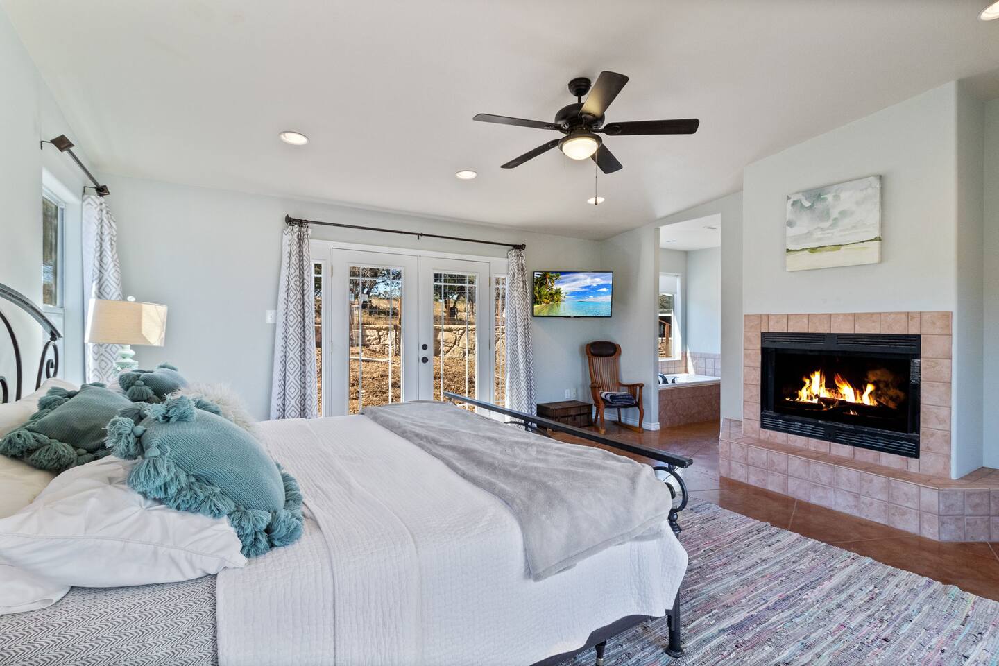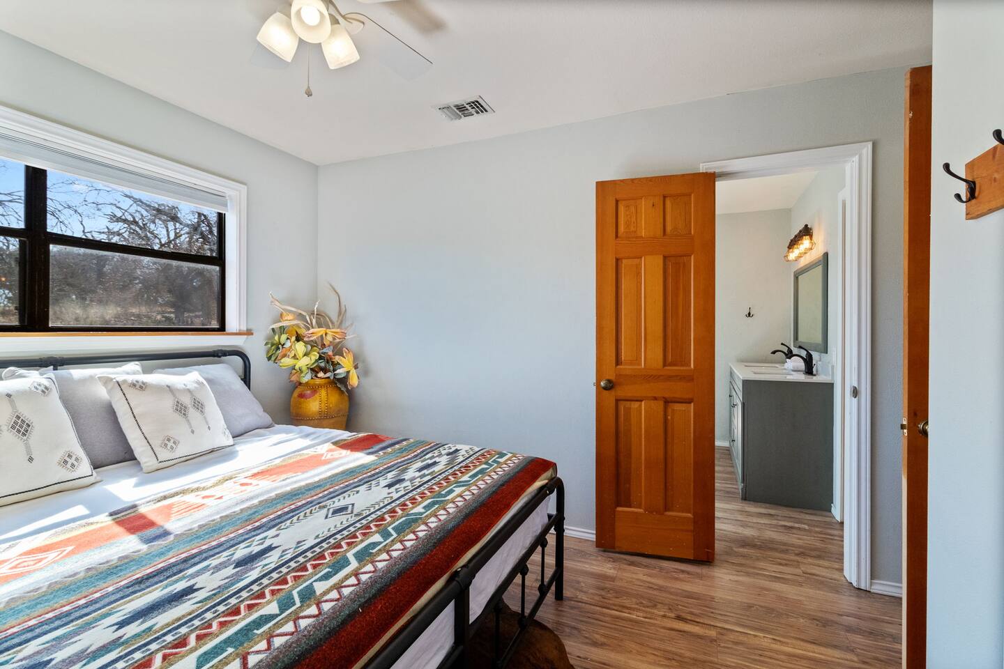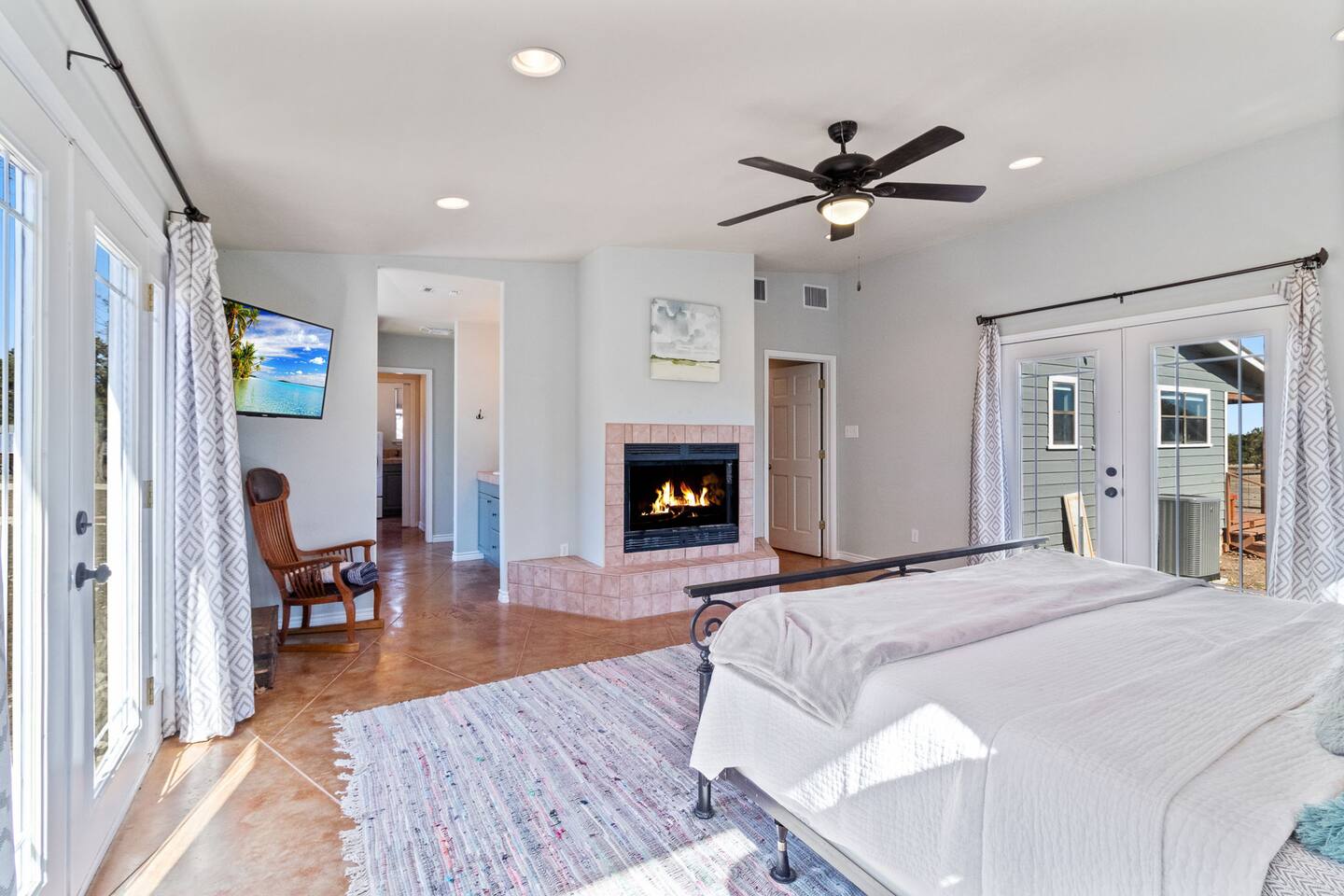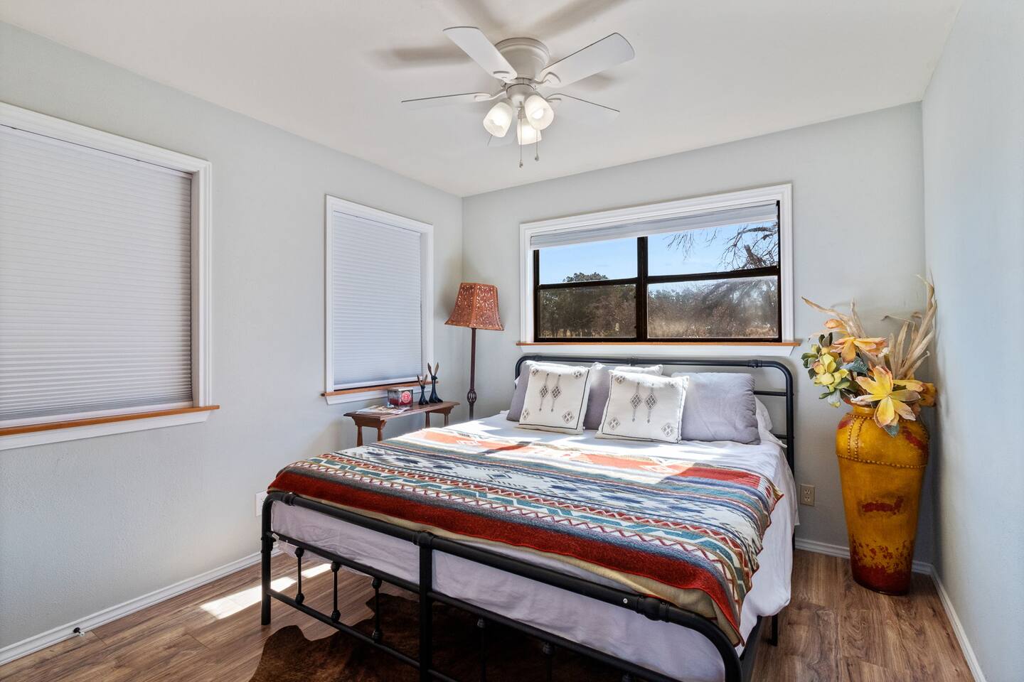 Porch & Prairie Ranch is your ultimate Texas ranch experience, just 30 minutes west of Fredericksburg, TX! Nestled within a vast 100-acre landscape, this offers you an unparalleled sense of privacy and seclusion, making it your ideal destination for seeking an escape from the hustle and bustle of your everyday life! You'll have high speed and reliable StarLink access during your stay! Your adventure begins as you step inside your spacious 3 bedrooms and 3 pristine bathrooms, a 'Texas Hill Country Ranch Rental' that blends rustic charm with modern comfort. The highlight is the cozy en-suite, providing you a tranquil sanctuary for relaxation! 8 adults will sleep comfortably in the main house with space for as additional 12 in the barn bunk room, complete with a mini split providing heated and cooled air all year round! The barn bunk room is designed for extra guests as there is no restroom tied to the bunk room. Bunk room guests will use the restrooms located inside the main home for use. Your haven is designed to accommodate up to 20 guests maximum(8-9 guests in the main house and 11-12 more guests in the bunk room inside the event barn). Event barn contains a bunk room with 3 sets of twin over full with trundle bunk beds that accommodates 12 when all sleeping surfaces are used, billiards and jacuzzi. This space shares bathroom and shower located in the main house. The barn does not have a bathroom or shower. Dive into your private swimming pool (not heated), relax in the jacuzzi or unwind on the inviting wrap-around porch, perfect for capturing 'Sunset Views in Texas'! Whether you're looking for a private family retreat, a romantic getaway, or a destination to celebrate life's special moments (think micro-wedding, family reunion, corporate event space), the Porch & Prairie Ranch has it all for you! Savor the peaceful seclusion of our 100-acre ranch, where you will be encircled by the quiet splendor of the natural world and the endearing companionship of our resident sheep and steer (as shown in the picture). Get exclusive use of our barn, which is furnished with a jacuzzi and pool tables and is ideal for entertaining and unwinding. This is more than just a getaway—it's a chance to create unforgettable memories in a picturesque countryside setting. Don’t miss this opportunity to experience your ranch style living. Book your stay today and start making memories that will last a lifetime! PLEASE NOTE: If you are looking to host an event of 16+ guests there are additional fees ranging from 1k - 10K :) A $500 refundable deposit will be collected after your booking is confirmed.